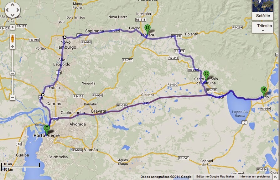 Em torno das 17:30 h parti em direção ao município de Taquara, pela RS 474. São cerca de 27 Km até a RS 239, onde termina a RS 474. A estrada, embora de pista de mão dupla simples, é muito boa. Tem uma praça de pedágio, junto ao posto da Polícia Rodoviária, onde as motos são isentas. Ao chegar na RS 239, se segue à esquerda por aproximadamente 14 Km até chegarmos à Taquara.