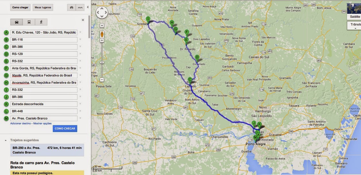 Pela BR 448 fomos até a BR 290 (13 Km) e, de lá entramos em Porto Alegre (6 Km) pela Av. Castelo Branco.