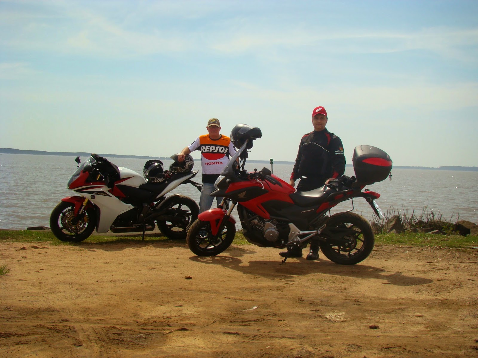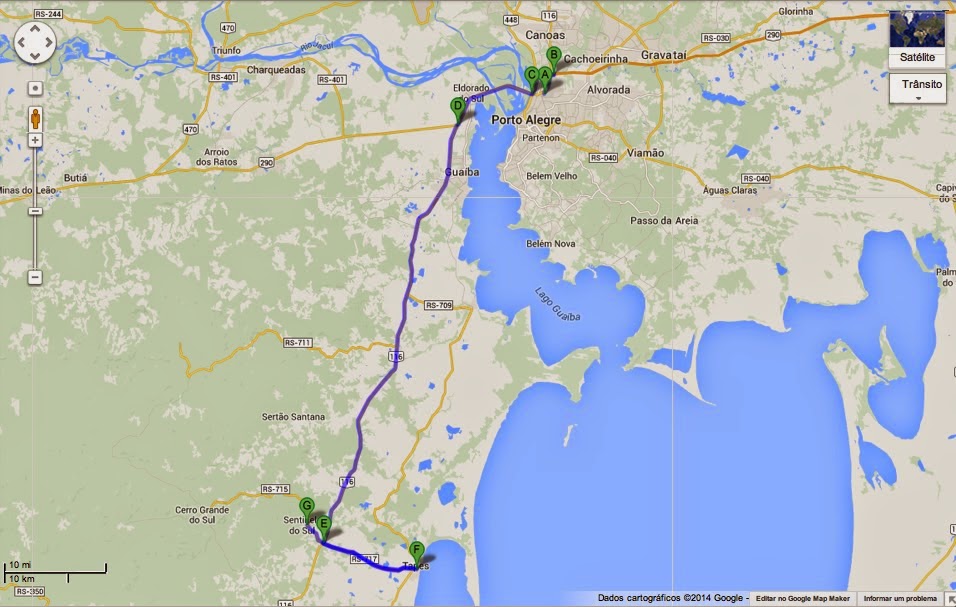 Saída de Porto Alegre no domingo, dia 14 de setembro de 2014, em torno das 9:30 horas da manhã. O ponto de encontro, sempre o mesmo, é no posto Shell da Rua Edu Chaves. Saímos em duas motos sendo eu na minha NC 700 X e o Gaston e a Adriana na CBR 600, em direção ao município de Tapes, ao sul de Porto Alegre.