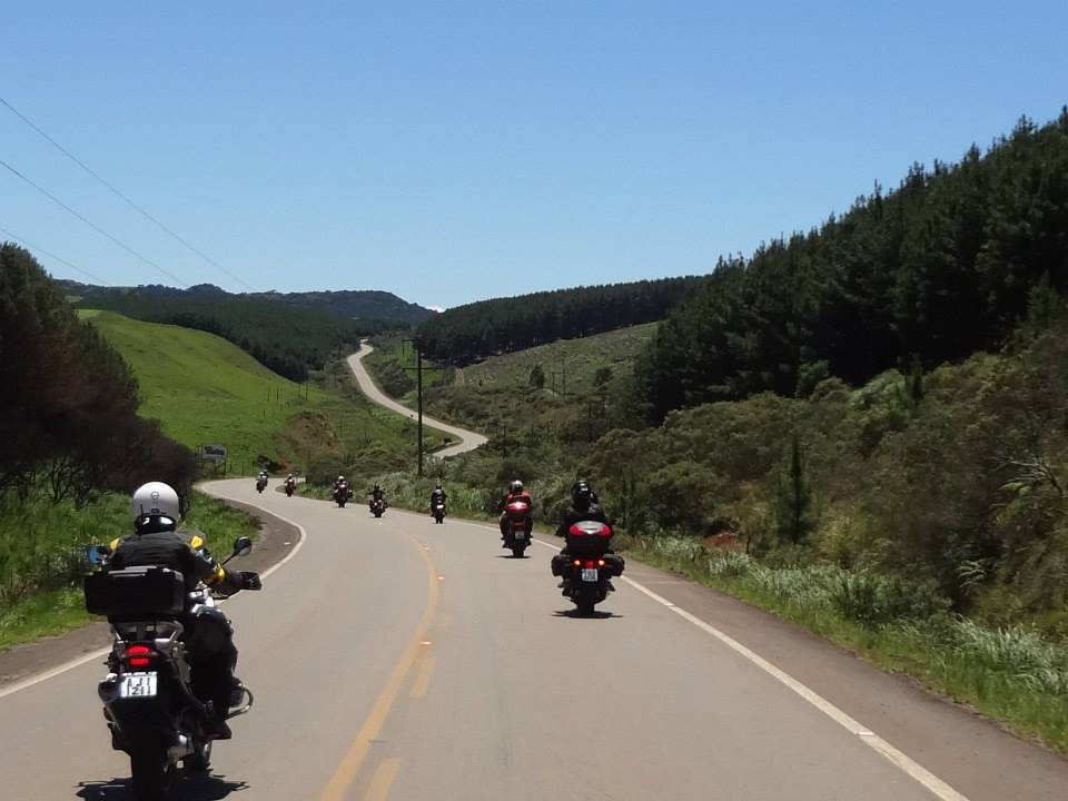 Fomos em um grupo formado agora por seis motos e as duas camionetes. Rumamos pela RS 020 por 28 Km até chegarmos à RS 453, onde se entra à esquerda e, após cerca de 14 Km, passa a ser a RS 486 sendo chamada Rota do Sol. Esta estrada é magnífica. São cerca de 20 Km de descida, com curvas muito fechadas e paisagem fantástica. O local é indescritível. Passa-se por viadutos em curvas dois túneis. A estrada é de duas vias de pista simples e de muito boa pavimentação. Após 21 Km na RS 486 paramos em uma das diversas tendas que existem à beira da estrada para um breve descanso. Seguimos por mais 19 Km, quando chegamos à BR 101.