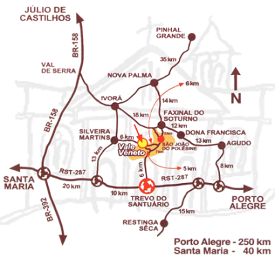 Após término do encontro comemorativo dos 10 anos da Facção Coração do Rio Grande do motogrupo Bodes do Asfalto, em Santa Maria, permaneci na cidade.  Resolvi, então,  fazer uma passeio pela região chamada de Quarta Colônia. Esta região, próxima à Santa Maria,  na região central do estado, é assim chamada por ser o quarto núcleo da colonização italiana no Rio Grande do Sul no século XIX e da qual fazem parte nove municípios: Silveira Martins, Ivorá, Nova Palma, Faxinal do Soturno, São João do Polêsine, Pinhal Grande, Dona Francisca, Agudo e Restinga Seca. Ali se pode encontrar diversas construções típicas italianas e igrejas, além de uma zona rural e costumes bastante característicos deste tipo de colonização.