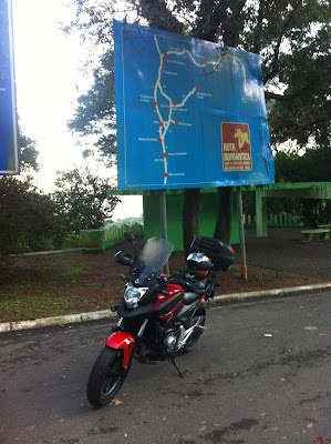 Saímos de casa em torno das 14:10 horas. Abastecemos a moto já na saída de Porto Alegre, saindo do posto de combustíveis às 14:30 horas. Rumamos pela BR 116 em direção à serra gaúcha, passando pelas cidades da região metropolitana de Porto Alegre, Vale dos Sinos, Ivoti, Dois Irmãos e, finalmente, chegando em Morro Reuter.