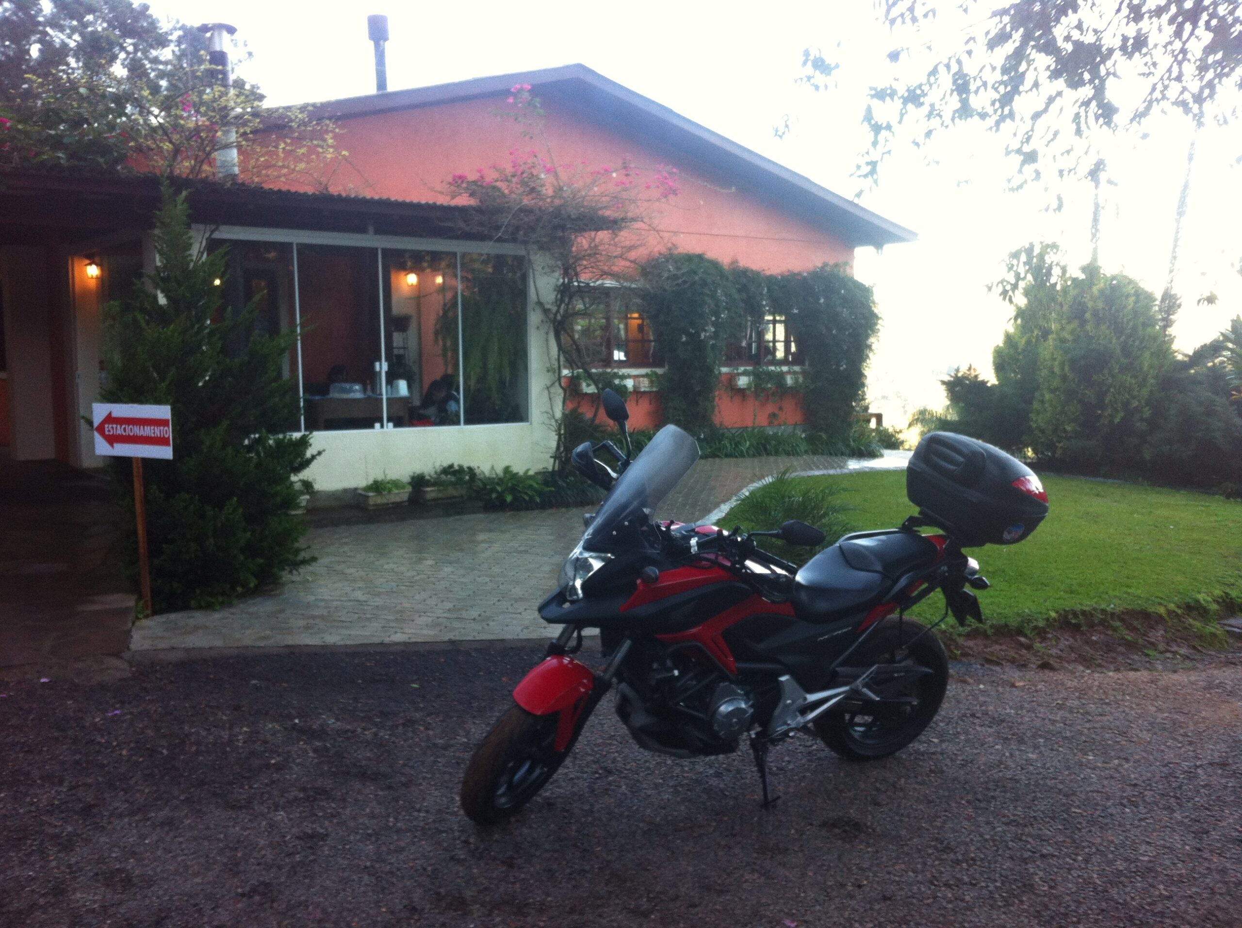 Saímos de casa em torno das 14:10 horas. Abastecemos a moto já na saída de Porto Alegre, saindo do posto de combustíveis às 14:30 horas. Rumamos pela BR 116 em direção à serra gaúcha, passando pelas cidades da região metropolitana de Porto Alegre, Vale dos Sinos, Ivoti, Dois Irmãos e, finalmente, chegando em Morro Reuter.
