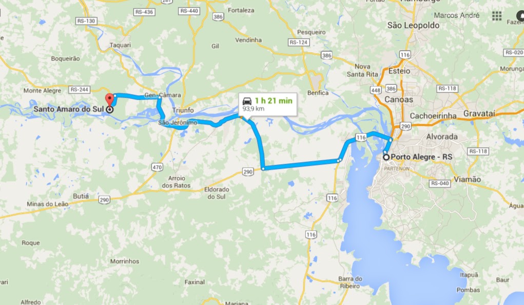 Seguimos pela BR 290 por mais 18 Km, onde acessamos a RS 401, à direita da via. Por esta estrada passamos pelas cidades de Charqueadas,  São Jerônimo e General Câmara. Neste ponto se acessa a RS 244 por mais cerca de 10 Km onde, à esquerda da via, se entra em uma estrada sem pavimento por mais cerca de 4 Km até Santo Amaro do Sul. Tem que prestar bem atenção pois a única placa indicando o acesso a Santo Amaro está localizada na margem direita da estrada e não é muito visível. Chegamos às 11:25 horas, com 92 Km rodados desde a saída de Porto Alegre. A estrada é muito boa, sendo duplicada na BR 290 até Eldorado do Sul e, após, passando à pista simples até chegarmos ao acesso a Santo Amaro.