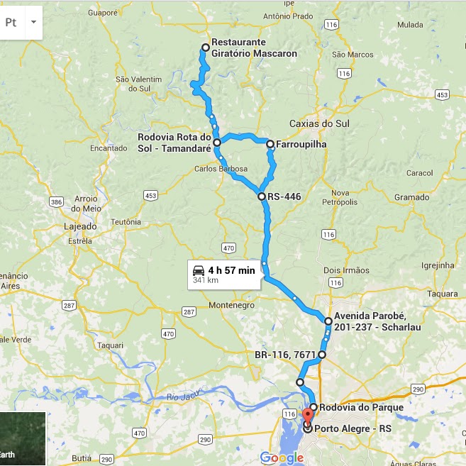 Seguimos de volta pela RS 122, RS 240, BR 116, BR 448 e BR 290 até chegarmos em Porto Alegre.