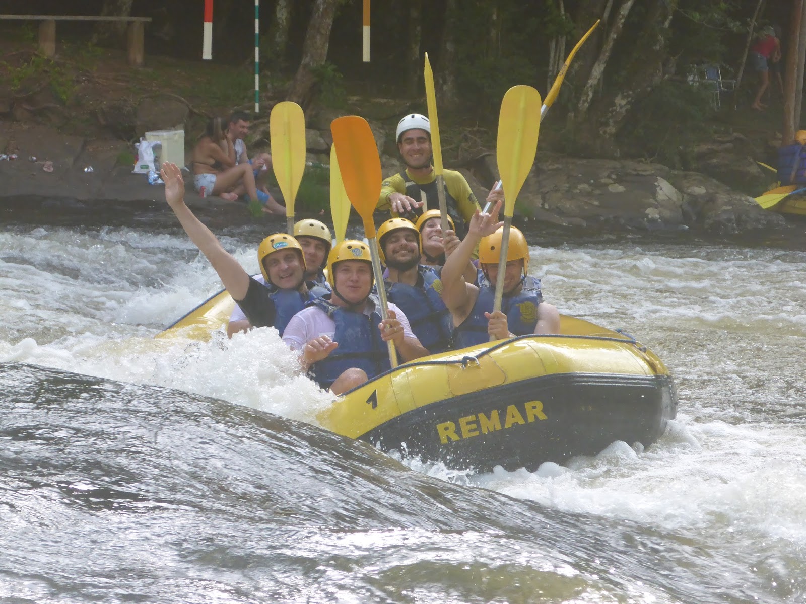 O rafting é feito com guias muito experientes, conhecedores do rio Paranhana e com um astral altíssimo. Os caras transmitem uma enorme segurança a todos nós. O trajeto pelo rio é de 7 Km de muita adrenalina e diversão, com direito a paradas para banho, mergulhos e brincadeiras. Tive o prazer de conhecer o Gustavo Selbach que é um canoísta olímpico, com diversos títulos na canoagem. O Gustavo é irmão do proprietário do parque e um dos guias dos botes de rafting, além de um cara sensacional.