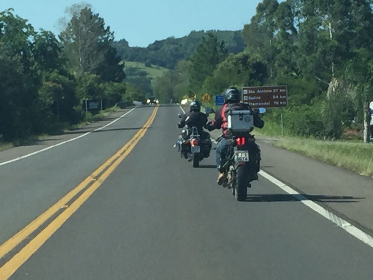 Sábado, dia 21 de janeiro de 2017.  Eu (Tiger 800 XCX) e meu filho André (Yamaha Virago 535) saímos de Porto Alegre em torno das 10 horas da manhã com destino à cidade de Três Coroas, na serra gaúcha. Nosso caminho iniciou na saída de Porto Alegre, pela Avenida da Legalidade e da Democracia (antiga avenida Castelo Branco), entrando na BR 290 (Free Way) no sentido Norte, seguindo por 2 Km até acessarmos a BR 448 (Rodovia do Parque) e, nesta, por mais 22 Km até a BR 116 no município de Sapucaia do Sul. Pela BR 116 andamos por 19 Km até a ERS 239, no município de Novo Hamburgo. As rodovias BR 290, BR 448 e ERS 239 são estradas com pista dupla e de excelente pavimentação. Na BR 448 se deve ter cuidado com algumas cabeçeiras de pontes devido ao desnível da via. Na ERS 239 existem diversos controladores de velocidade, além de uma intensa fiscalização por parte da Polícia Rodoviária Estadual. Nessa rodovia a velocidade máxima  é de 80 Km/h, porém com diversos trechos de reduções da velocidade, onde alguns são 60 Km/h e outros 50 Km/h, também fiscalizados constantemente.