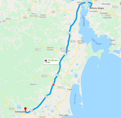 Saí sozinho em torno das 15 horas pela BR 290 em direção sul, seguindo por cerca de 14 Km a partir da ponte sobre o lago Guaíba e continuando pela BR 116. Essas duas rodovias, BR 290 e BR 116, correm juntas neste trajeto até sua divisão ao final destes 14 Km, quando a BR 290 segue em direção oeste e a BR 116 em direção sul. Deste ponto em diante são mais 110 Km até a entrada da cidade de Camaquã.