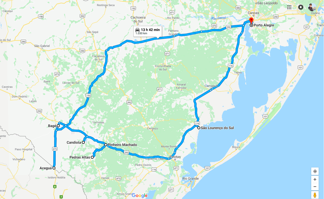 Neste passeio rodamos 1.101,5 Km em três dias. Andar de moto pelo Pampa Gaúcho faz com que voltemos no tempo e revivamos um pouco da história do Rio Grande do Sul, passando por lugares que foram palco de acontecimentos que nortearam o rumo do que hoje é nosso Estado. Porém, acima de tudo e como um sentimento muito pessoal, estar junto aos amigos de infância após 40 anos, faz com que a emoção seja bastante grande. Ver a vida de cada um, tomar conhecimento dos acontecimentos e relembrar o passado com memórias de fatos que parecem recentes, faz com que tenhamos a certeza de que os vínculos plantados com solidez jamais se perdem, independente do tempo e da distância. A nossa essência de menino permanece viva em cada um, hoje acrescida da maturidade que os anos nos deram. Muito obrigado pela acolhida e carinho, meus amigos.