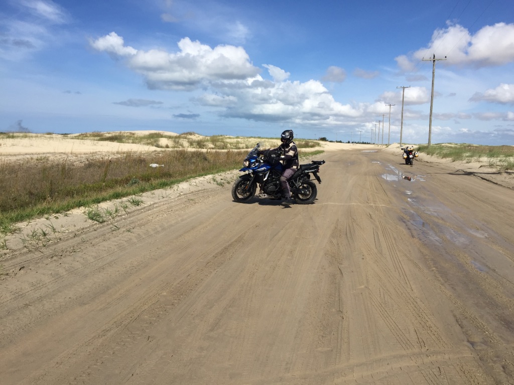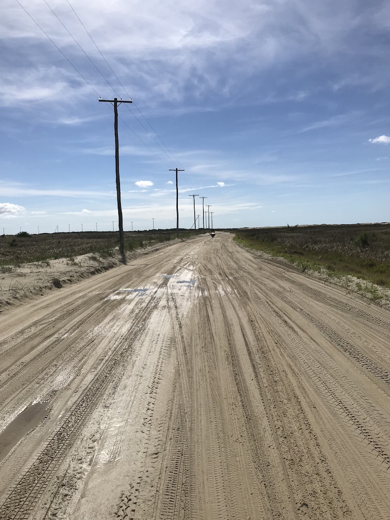 O acesso até a praia do Farol da Solidão é uma estrada de apenas 9 Km, sem pavimentação, com areia de praia. Como havia chovido, tivemos a sorte de passarmos por trechos com areia molhada, areia solta e água, o que faz com que a adrenalina e a diversão sejam maiores.