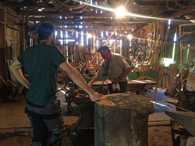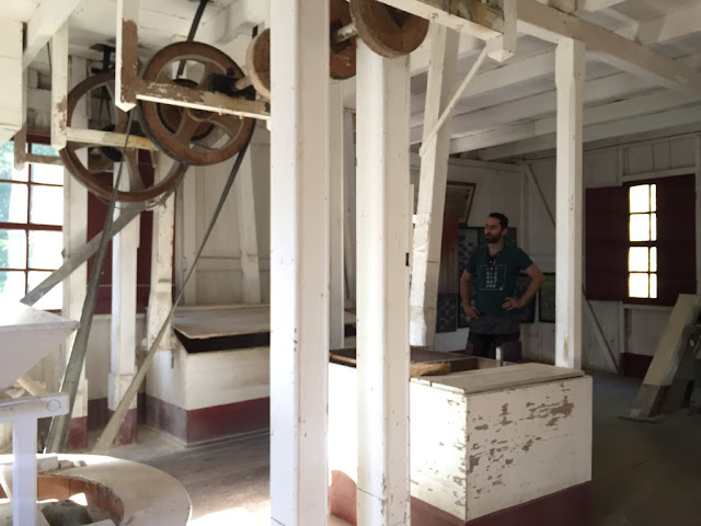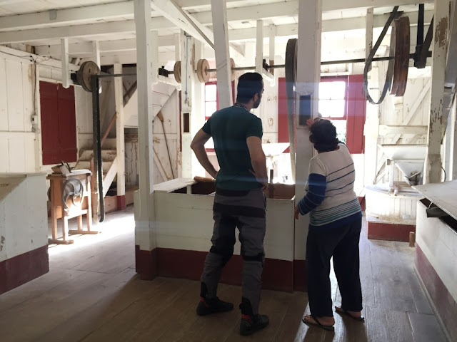 | Interior do Moinho Francescatto – a Sra. Catarina explicando o funcionamento do moinho ao Humberto |