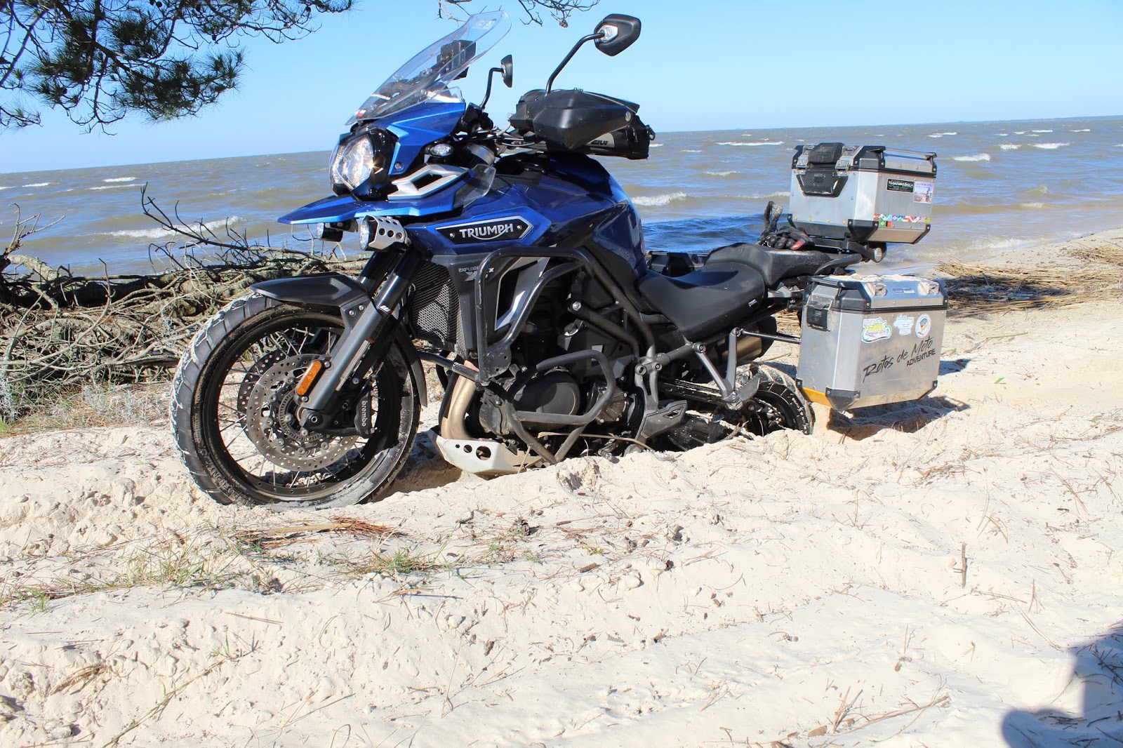 Pausa para as fotos da moto atolada na areia na beira da Lagoa dos Patos