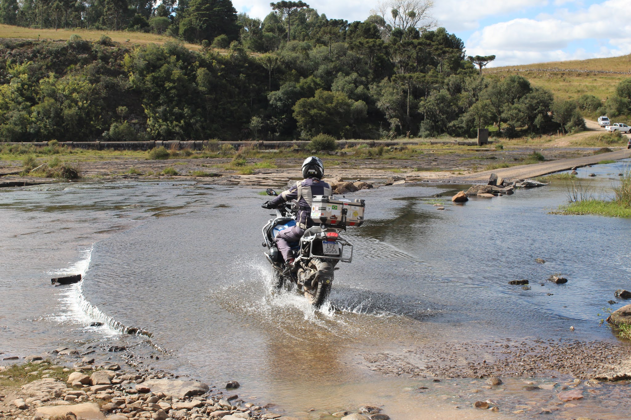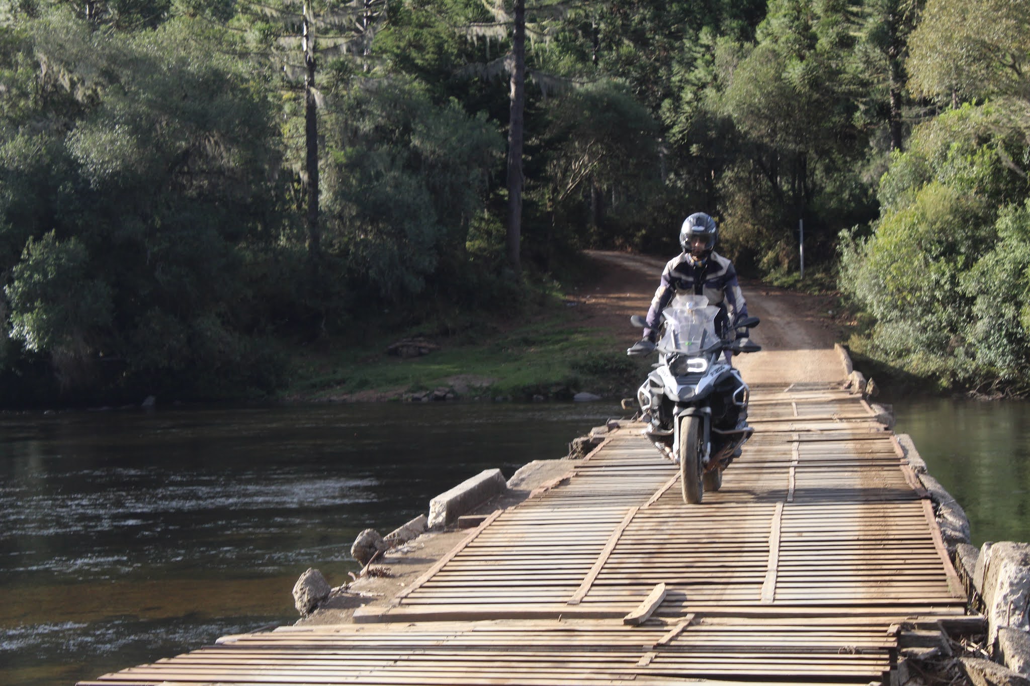 A Ponte das Goiabeira está localizada sobre o rio Pelotas, na divisa entre os Estados do Rio Grande do Sul e Santa Catarina e é conhecida por seu estado bastante precário. Ao chegarmos na ponte nos deparamos com uma estrutura bastante danificada sobre o leito do rio Pelotas e com uma placa de advertência onde diz: “PONTE INTERDITADA PASSAGEM PROIBIDA”. Já na entrada estão toras de madeira que desencorajam a querer entrar com as motos, mas como foi para isso que fomos até lá não existe qualquer possibilidade de desistirmos. Atravessamos a ponte até o lado oposto, entrando do Estado de Santa Catarina, e retornamos para o lado gaúcho. A paisagem ali não foge à regra da região, com uma beleza ímpar onde o rio Pelotas corre através dos Campos de Cima da Serra. Do final da ponte até a cidade catarinense de São Joaquim são mais 30 Km. Nosso planejamento inicial seria seguirmos até São Joaquim onde passaríamos à noite, porém como não havíamos conseguido hospedagem retornamos para Bom Jesus. Na volta ainda pegamos os últimos quilômetros após a barragem ao anoitecer nos dando a oportunidade, embora breve, de um off road noturno.
