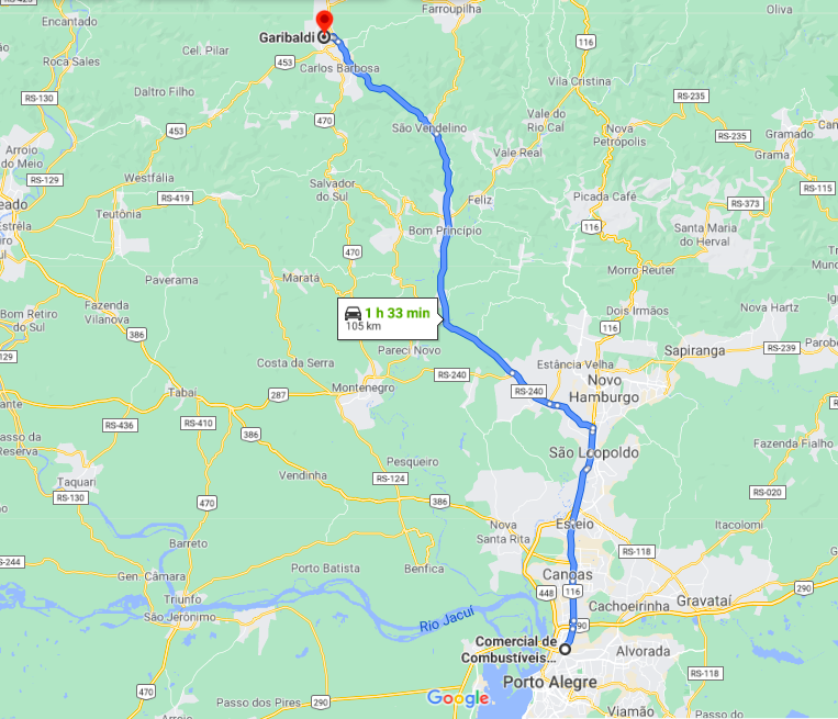 Sábado, dia 07 de agosto de 2021.Saímos de Porto Alegre às 9h15min com destino à cidade de Garibaldi, na serra gaúcha. Seguimos pela BR 116 por cerca de 30 Km até a RS 240, na localidade de Scharlau, município de Novo Hamburgo. Continuamos por 13 Km até a ERS 122 e mais 38 Km até a ERS 446 onde existe uma elevada que cruza sobre a ERS 122. Após a elevada se percorre mais 17 Km até a BR 470 no município de Carlos Barbosa, seguindo mais cerca de 3,6 Km por essa rodovia até a entrada da cidade de Garibaldi, onde chegamos em torno das 11h05min.