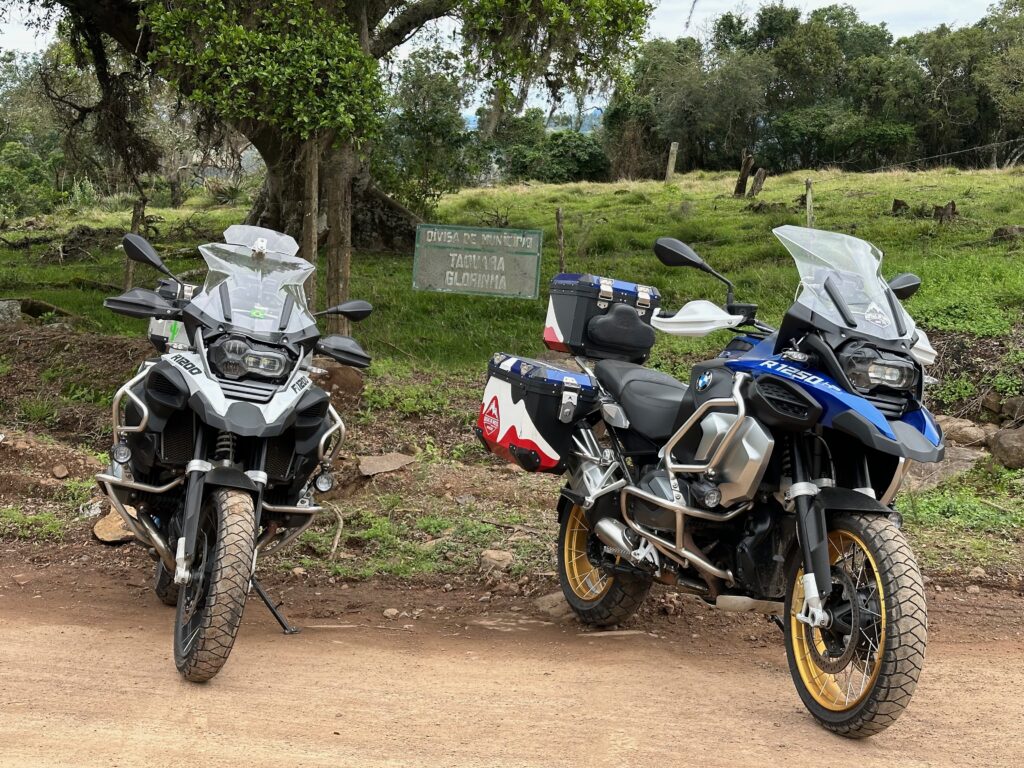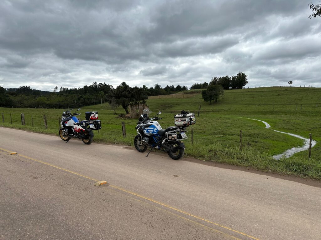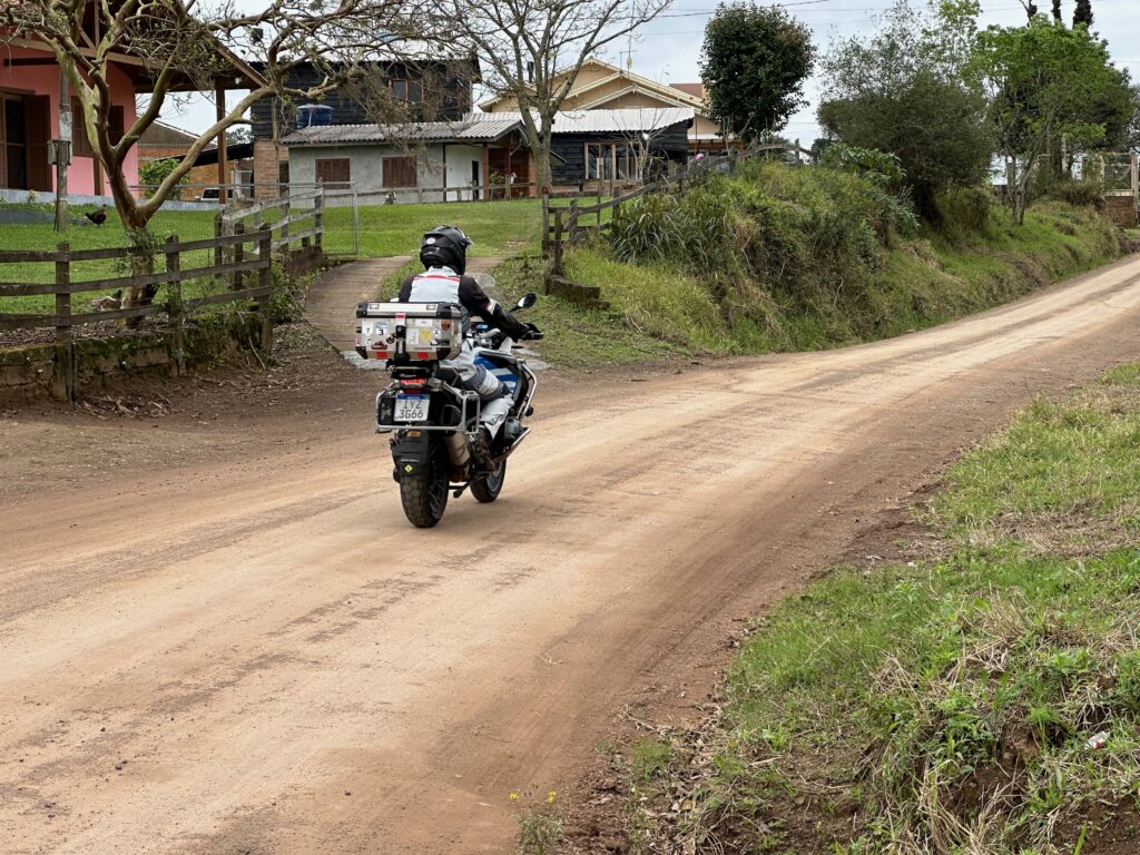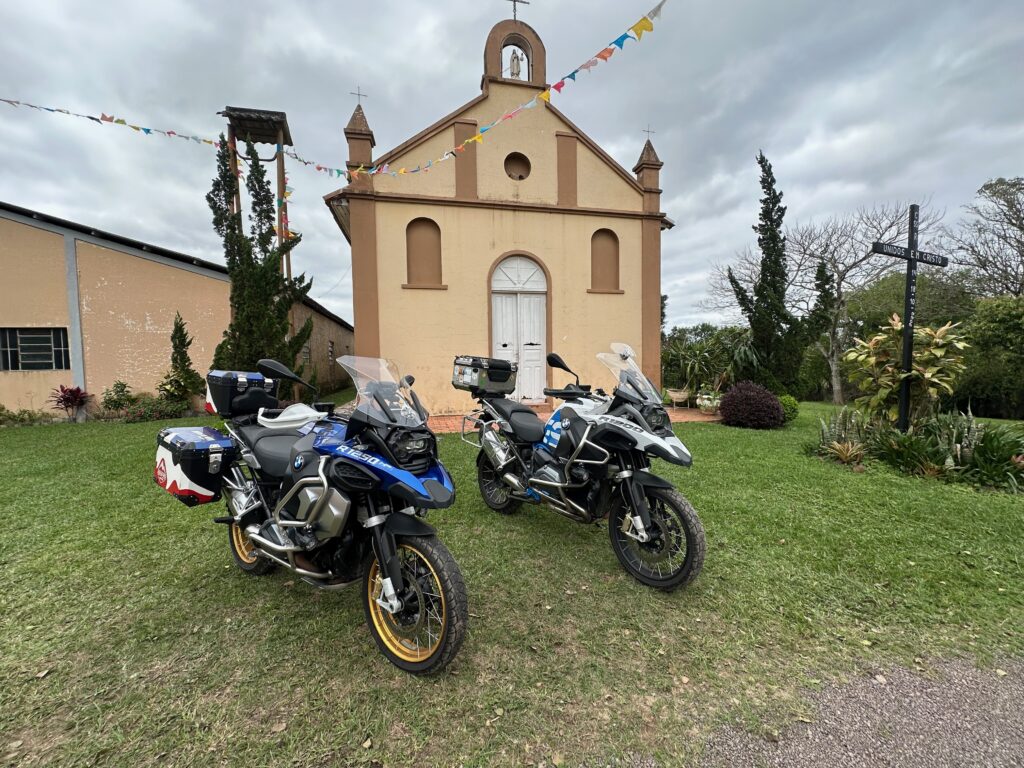 Saímos de Porto Alegre pela BR 290 às 10h15min da manhã com destino à zona rural entre os municípios de Glorinha e Taquara. Após percorremos 20 km por esta rodovia, chegamos ao viaduto de acesso à cidade de Gravataí onde, após cruzarmos sob a BR 290, poucos metros à frente entramos na rodovia RS 030, seguindo por mais 24 km em direção à cidade de Glorinha até a avenida João Osvaldo da Rosa, à esquerda da rodovia. No caminho, já no município de Glorinha, paramos para um lanche no restaurante e padaria Silva, um local bastante agradável e com uma grande variedade de produtos. Entramos na avenida João Osvaldo da Rosa e seguimos por cerca de 450 metros até o entroncamento da estrada Passo do Portão, caminho da esquerda, por onde seguimos 10Km até outro entroncamento, entrando na estrada do Maracanã, à esquerda da via, poucos metros após passarmos pelo cemitério do Maracanã. Continuamos pela estrada do Maracanã por mais 12 km até chegarmos à igreja Santa Cruz do Pinhal. Logo à frente da igreja, no lado oposto da estrada, percebemos uma casa bastante grande e antiga que inicialmente pensamos se tratar da residência do padre. Paramos em frente à casa para tirarmos algumas fotos quando, naquele momento, surgiu o morador que veio conversar conosco. Percebendo que não se tratava do padre, imaginamos se tratar de um morador da zona rural com apreço por motos e aventuras, o que algumas vezes ocorre quando andamos por regiões como esta. Qual nossa surpresa quando descobrimos que se tratava do Alexandre Möeller, um grande empresário do ramo de motociclismo já sendo proprietário de concessionárias como Yamaha, Ducatti, BMW e KTM, além de piloto extremamente experiente e competidor de provas famosas como o Rally Dakar e o Rally dos Sertões, além de outras tantas. Após alguns minutos de conversas identificamos diversos amigos em comum do meio do motociclismo. Continuamos nossa conversa em sua casa junto a um café recém feito pela Simone, sua esposa, que foi quem percebeu que nossas motos haviam parado em frente à casa e identificando se tratar de duas BMW ao ouvir o ronco dos motores. A casa é uma propriedade familiar desde o avô do nosso anfitrião, estando na família há várias gerações. Junto ao muro da frente existe um quadrado de concreto com uma cruz de madeira onde estão sepultados diversos soldados que ali lutaram um uma batalha durante a revolução Farroupilha. Foram momentos de uma conversa muito agradável com um cara sensacional, com grande conhecimento do mundo das motos e extremamente simples, hoje exercendo sua atividade profissional como empresário do ramo de motociclismo em São Paulo.