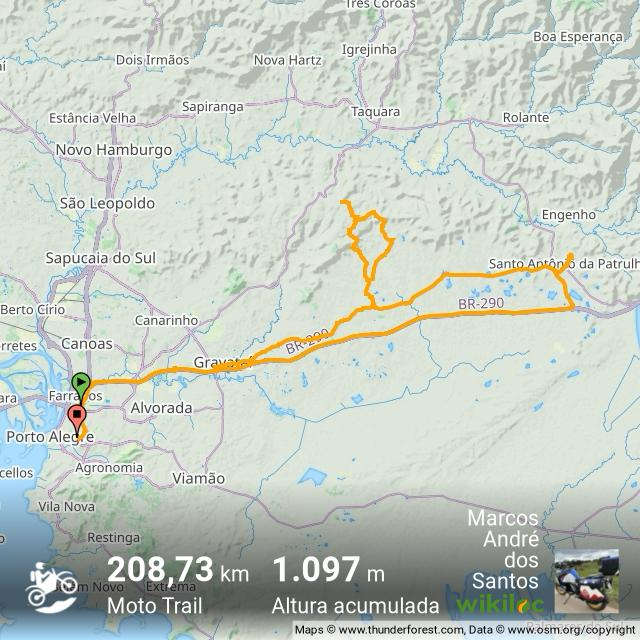 Saímos da casa do Alexandre e retornamos pela estrada do Maracanã por 3,8Km onde à direita entramos na estrada Contendas – Santa Cruz do Pinhal. Por esta rodamos 11,4 km até a estrada do Portão, seguindo por mais 4 km até a RS 030, totalizando cerca de 41 km de offroad. As estradas percorridas são de um nível de pilotagem bastante fácil, sendo que o trajeto na estrada Contendas – Santa Cruz do Pinhal tem trechos um pouco mais estreitos, passando por uma pequena serra onde do alto de tem uma vista panorâmica da região, porém sem elevar significativamente o nível de dificuldade da pilotagem.